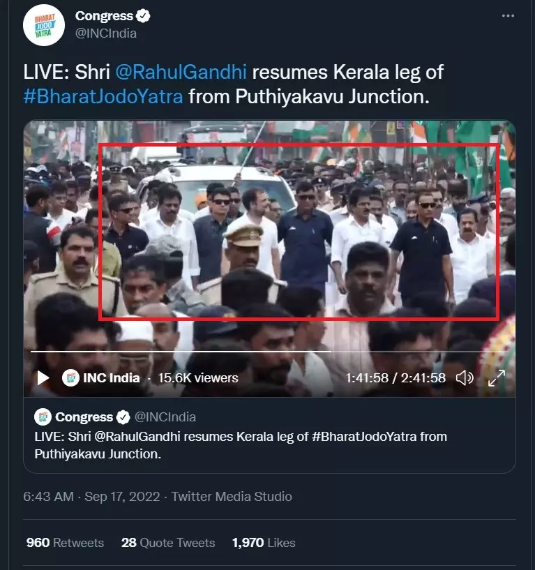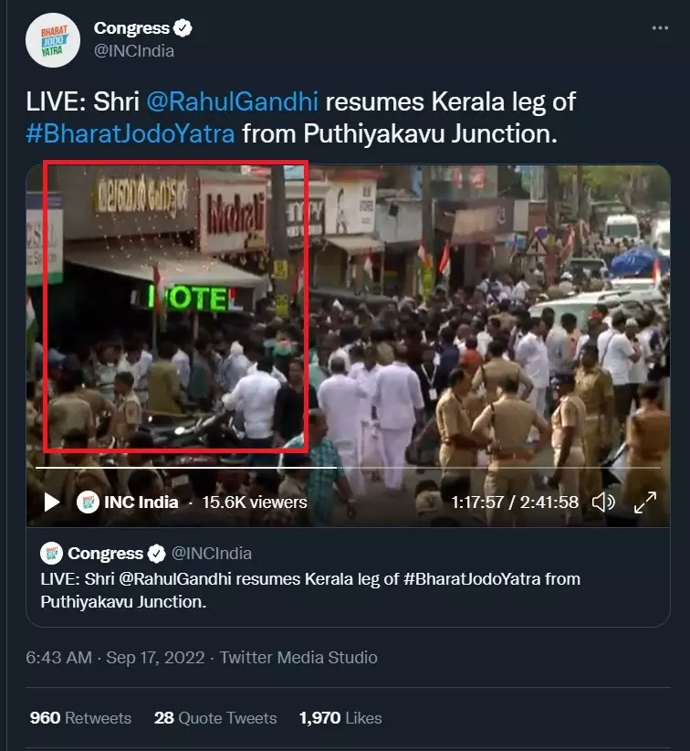 Additionally, we also checked the live footage of Bharat Jodo Yatra telecast by Congress's official Twitter handle which started at 6.43 am on September 17, 2022. From the 1:17:00 minutes timetamp, we can see the same hotel - Hotel Malabar, where Rahul Gandhi and other Congress leaders enter to have breakfast.