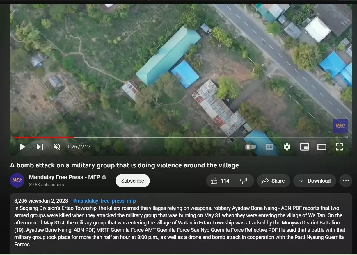 A rough translation of the YouTube description in Burmese translates to, local defense forces attacked the Myanmar Military who were destroying villages in Ayadaw Township in Sagaing Division by using drones and dropping bombs. As a result of this attack, 2 military soldiers were killed and many were injured.