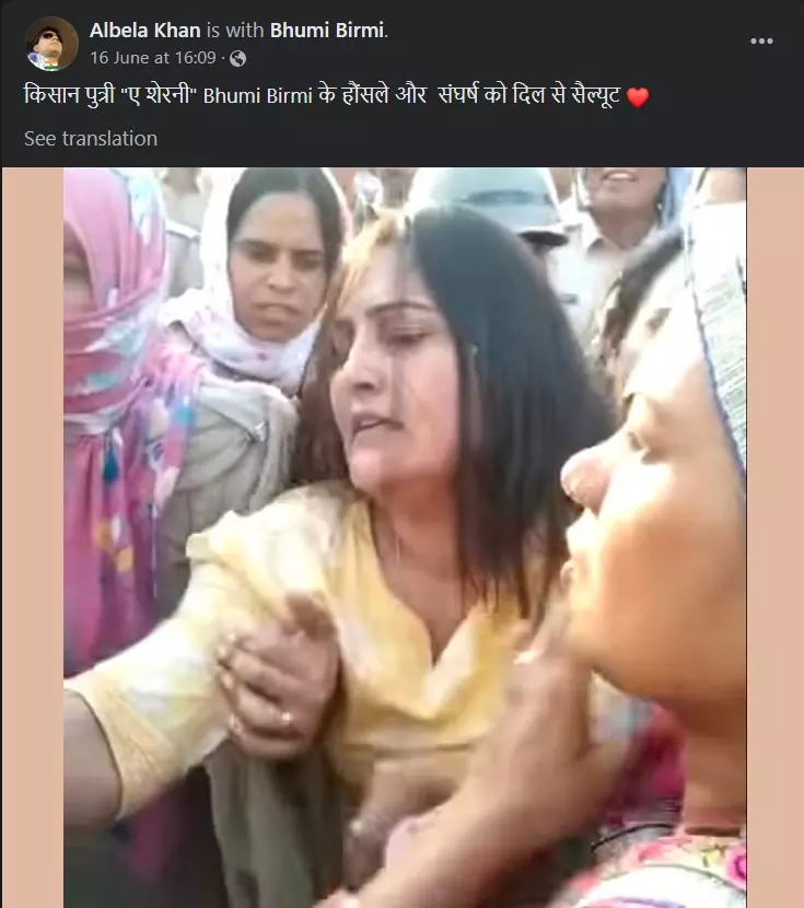 We then looked up Birmi's profile on Facebook and found that she is the woman seen in the viral video. Birmi's Facebook profile states that she is the district president, Women Wing of Bhartiya Kisan Union (Non-political), Churu, Rajasthan.