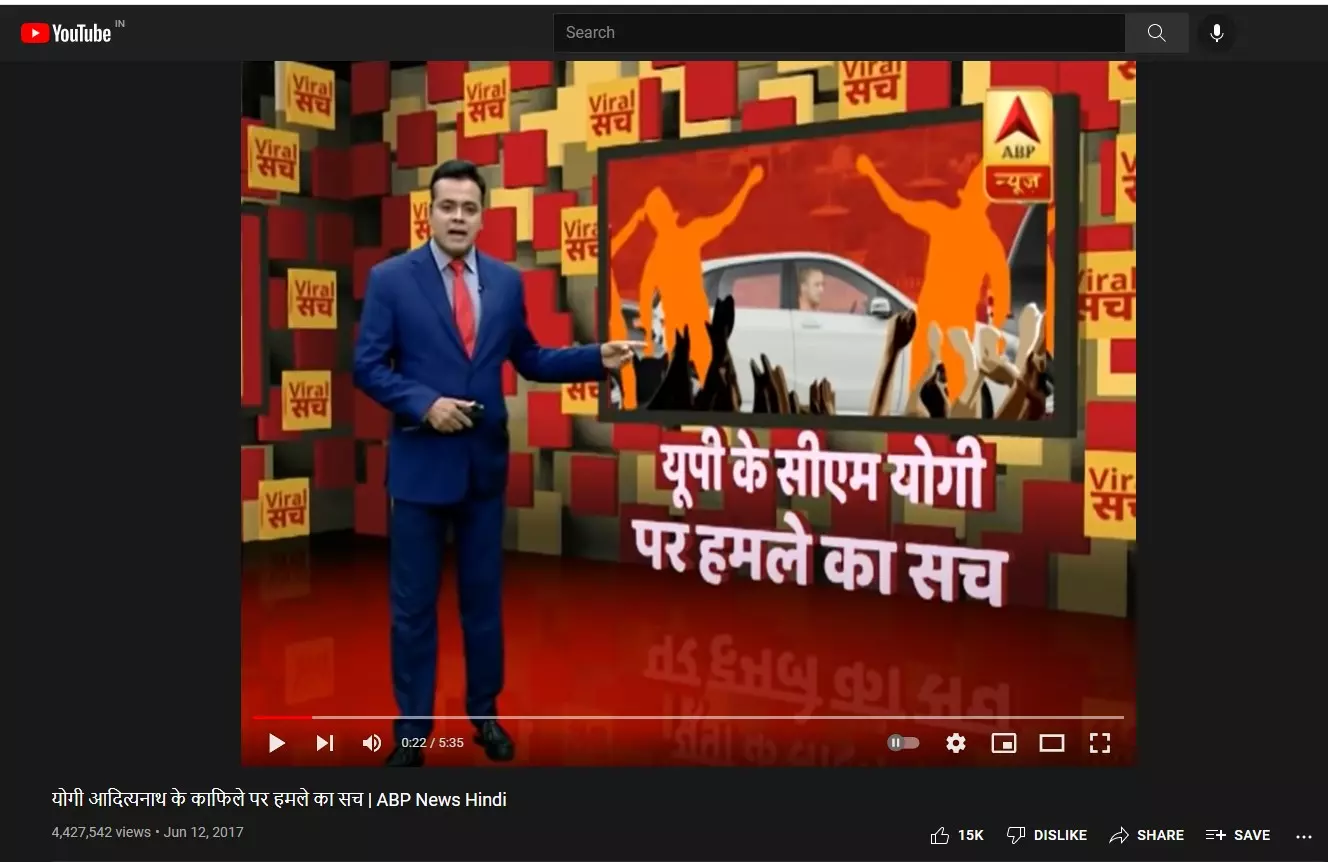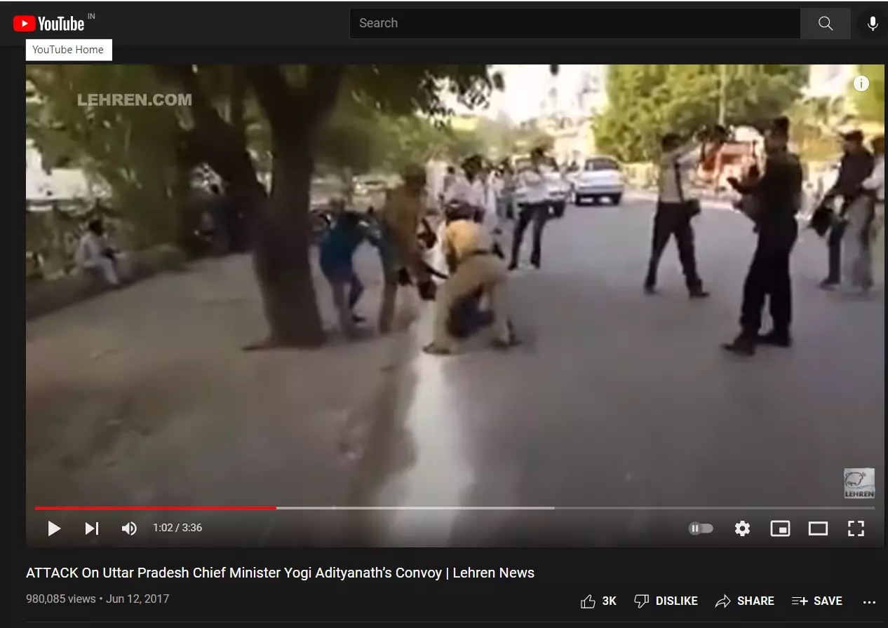 Taking hints from the video and running a selected keyword search like "Yogi Adityanath convoy attacked", we found that the same video was uploaded in June 2017 by Lehren News. We can see the same sequence of events as in the viral video