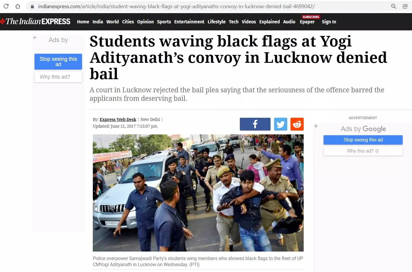 We also found several news reports on the same incident. Eleven students, including two girls, who were taken into judicial custody for stopping Uttar Pradesh Chief Minister Yogi Adityanath's convoy, and were denied bail reported The Indian Express on June 7, 2017.