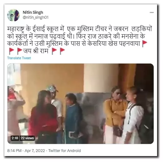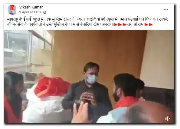 (Original Text in Hindi: महाराष्ट्र के ईसाई स्कूल में एक मुस्लिम टीचर ने जबरन लड़कियों को स्कूल में नमाज पढ़वाई थी। फिर राज ठाकरे की मनसेना के कार्यकर्ता ने उसी मुस्लिम के पास से केसरिया खेस पहनवाया जय श्री राम)