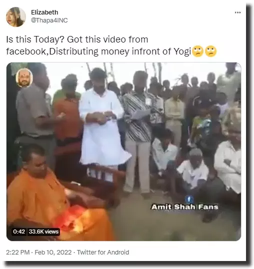 The caption with the video reads as, "Is this Today? Got this video from facebook, Distributing money in front of Yogi" (sic).
