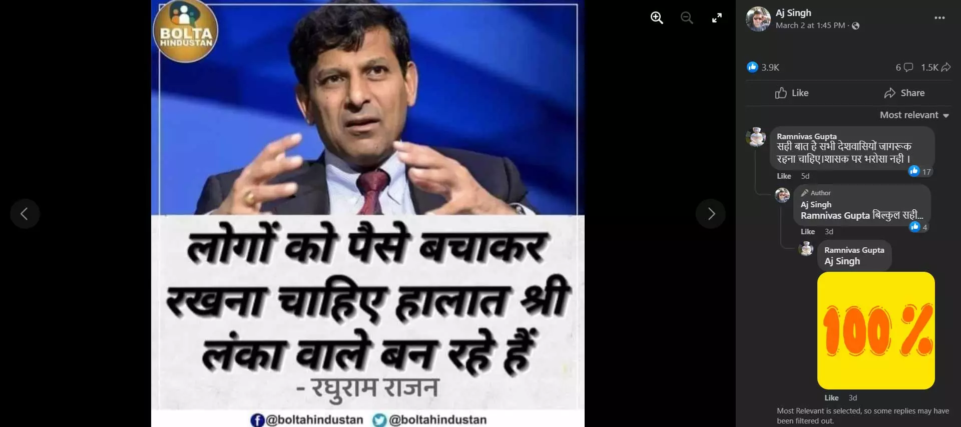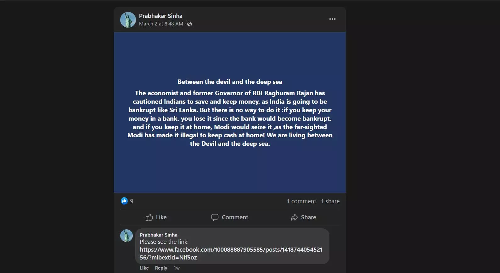 We found another posting the same quote in English, with the caption, "The economist and former Governor of RBI Raghuram Rajan has cautioned Indians to save and keep money, as India is going to be bankrupt like Sri Lanka."