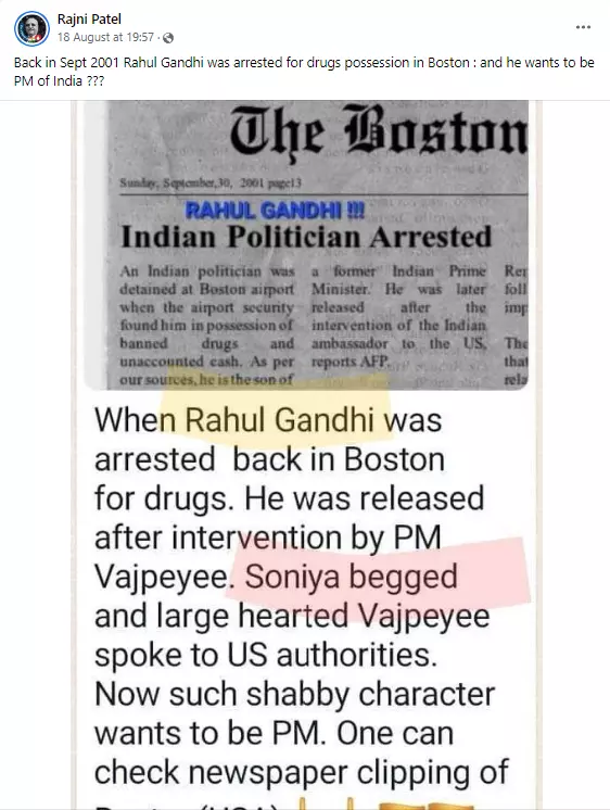 A newspaper clipping claiming that Rahul Gandhi was arrested at Boston airport for the possession of drugs is circulating on social media. It claims that this is a 2001 incident and Rahul was released from custody only after the intervention of then Prime Minister Atal Bihari Vajpayee, after he talked to US authorities upon Sonia Gandhi's requests.