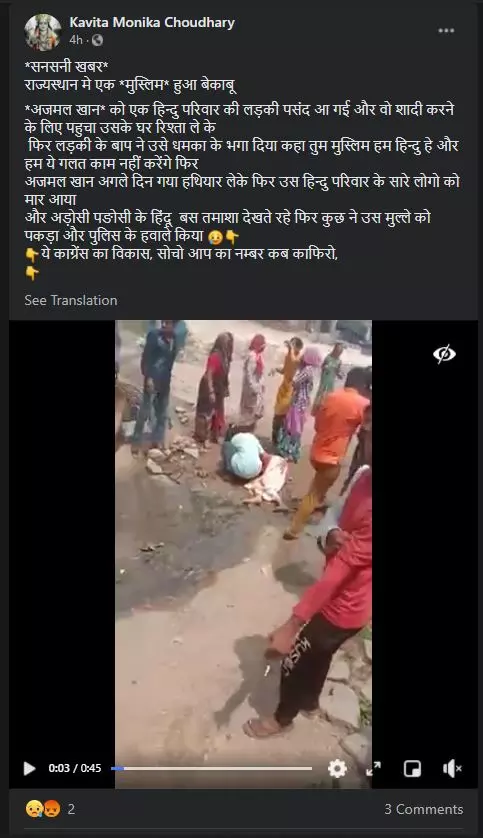The graphic video is being shared with a caption which translates to 'A Muslim man went out of control in Rajasthan. Ajmal Khan liked a girl from a Hindu family and went to her house with a proposal. The girl's father threatened and chased him away, saying you are Muslim, we are Hindu and we will not do this. Later, Ajmal Khan went to the home with weapons and killed all the family members of the Hindu family. And the Hindu neighbors just watched. Later, some people caught him and handed over to the police'.