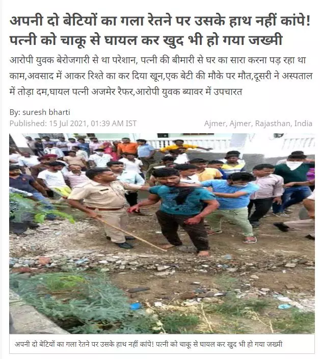 Times of India reported on July 14, 2021, that the incident occurred in Beawar town in Ajmer and the accused had a quarrel with his wife Kavita on the night of July 13. The next day he consumed liquor and attacked her with a knife and when his daughters screamed for help, he stabbed them to death injuring himself in the process.