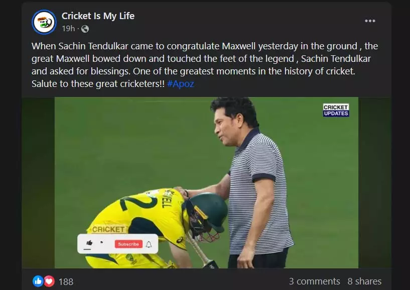 Several users on Facebook shared the image with the caption, "When Sachin Tendulkar came to congratulate Maxwell yesterday in the ground, the great Maxwell bowed down and touched the feet of the legend, Sachin Tendulkar and asked for blessings. One of the greatest moments in the history of cricket. Salute to these great cricketers!!"