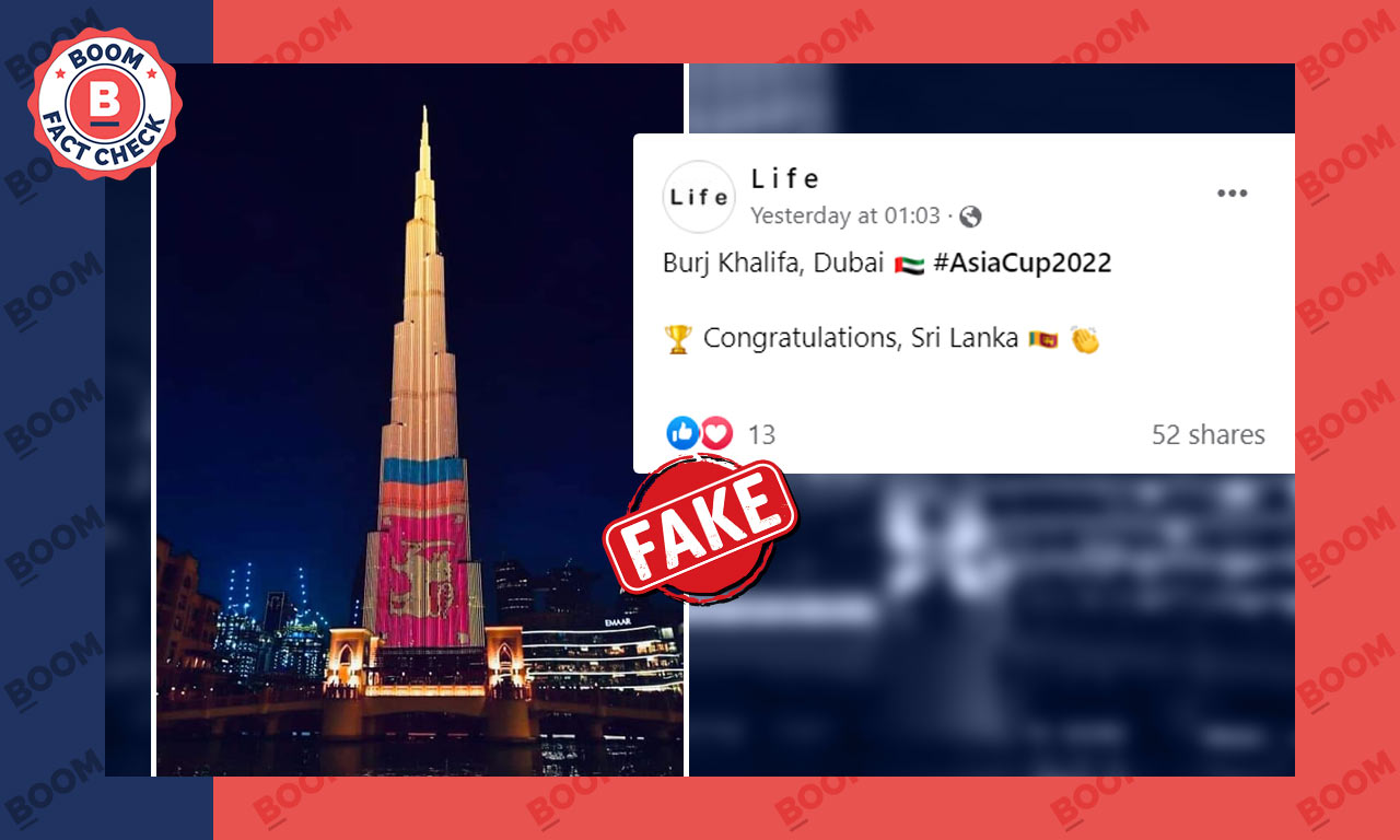 An image of the Sri Lankan flag being displayed on the Burj Khalifa, the popular skyscraper of Dubai, is being circulated widely on social media claiming that the flag was displayed on the Dubai landmark after Sri Lanka's cricket team won the Asia Cup 2022 on September 11, 2022.