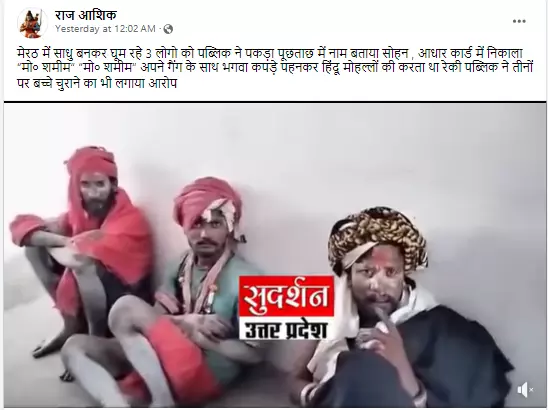 The video was posted on X by Sudarshan News UP handle which amplified the claim further stating that one of the sadhu's name is Mohammed Shamim. According to Sudarshan News UP's X post, the three men falsely identified themselves as Hindus. The caption further claims, "Their Aadhaar Card says the name is Mohammed Shamim. Mohd. Shamim along with his gang used to do recce of Hindu localities wearing saffron clothes. The public also accused the three of stealing children."