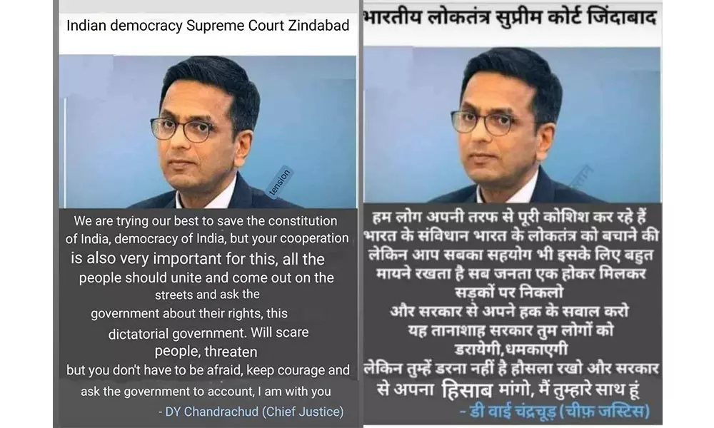A message is going viral on WhatsApp, which depicts the image of Chief Justice of India (CJI) DY Chandrachud with a text purported to be a quote from him, urging people to go out in the streets, and protest against the government.