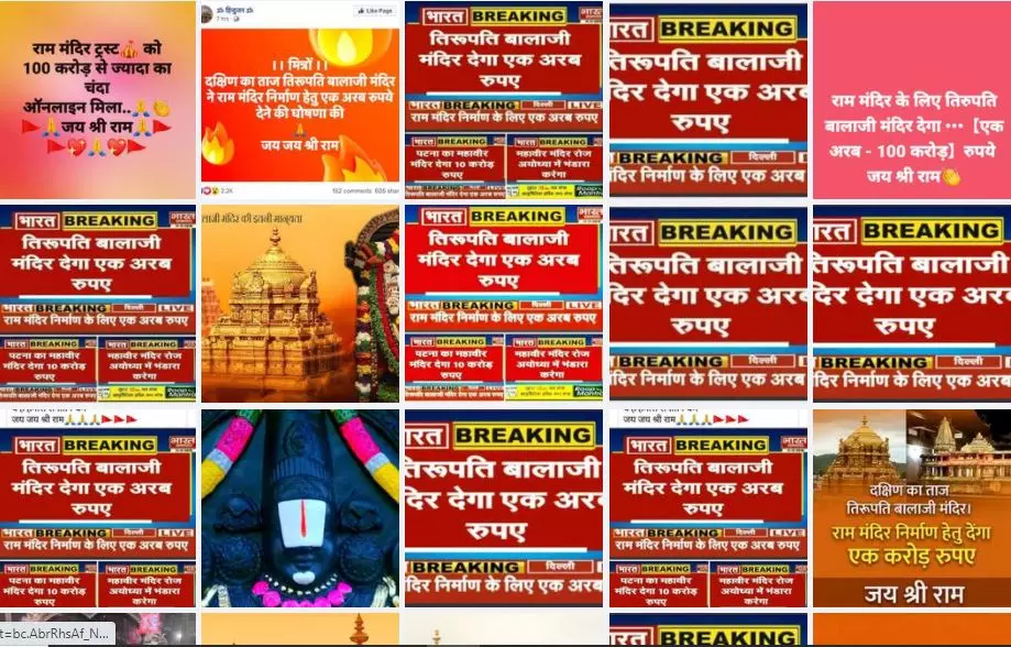 A Hindi caption with the viral post translates to 'Tirupati Balaji temple will donate 1 billion rupees for the construction of Ram temple. Hail lord Ram. #Jai_Shree_Ram_challenge'.