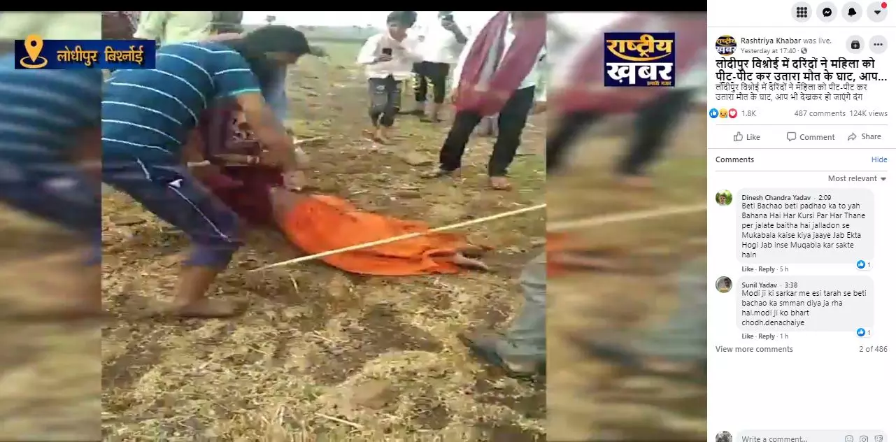 Speaking in Hindi, the man says, "Friends, I have uploaded a video right now. That is my sister's dead body. This is Lodhipur Vishnoi and friends I am at the police station right now. The policemen are not taking any action. I am at Majholi police station. Friends, neither the media is listening to us nor are the cops taking any action. I need you help friends, this video should reach higher up. She is my cousin sister. Please share the video brothers."