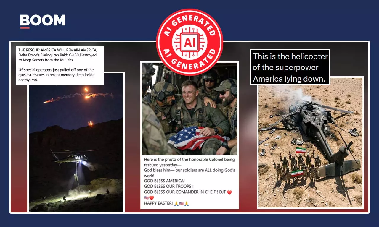 Several photos created using AI and appearing to show US military aircraft being destroyed by Iranian forces and a pilot rescue operation are being shared online as real.