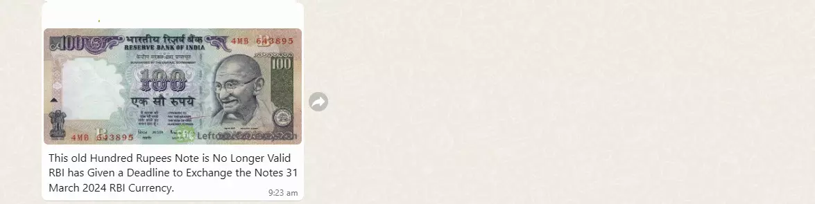 A message has recently gone viral on WhatsApp falsely claiming that the Reserve Bank of India (RBI) has imposed a deadline to exchange the old 100-rupee banknote till March, 2024, declaring it invalid as legal tender.