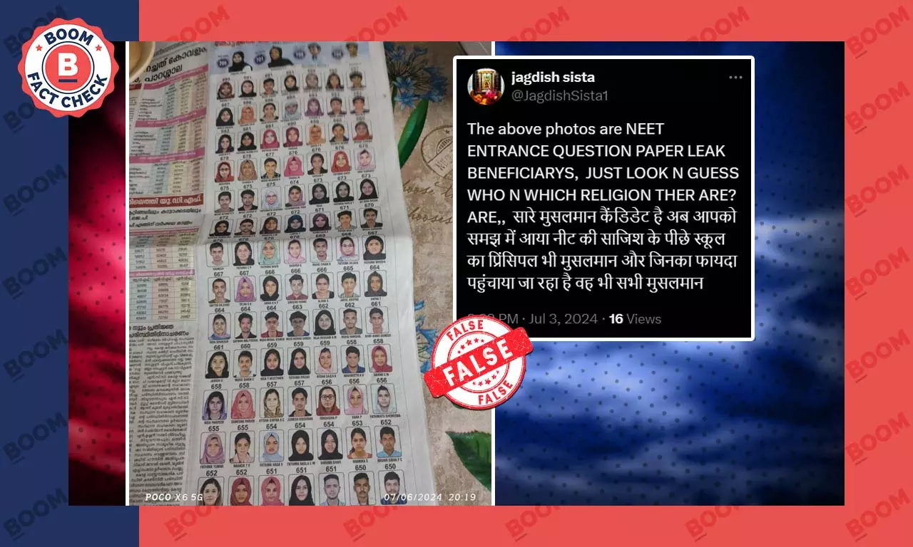 Viral social media posts featuring a Malayalam newspaper advertisement of students and their National Eligibility cum Entrance Test (NEET) scores, is being shared online with a false and communal claim that Muslim NEET aspirants were the main beneficiaries of the question paper leak fiasco.