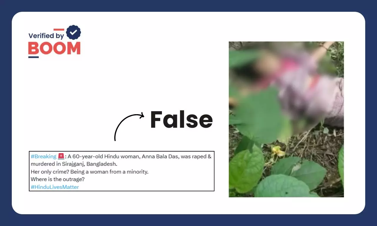 A verified handle on X , Voice Of Bangladeshi Hindus, posted the photo with the caption, “Breaking: A 60-year-old Hindu woman, Anna Bala Das, was raped and murdered in Sirajganj, Bangladesh. Her only crime? Being a woman from a minority. Where is the outrage?”