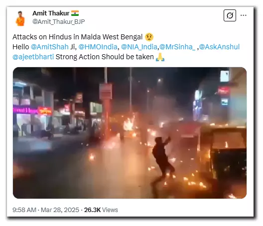 A viral 14-second video of people vandalising vehicles on the street including setting ablaze an ambulance is being shared with the false claim, "Attacks on Hindus in Malda, West Bengal." The claim further asks Home Minister Amit Shah to take action.