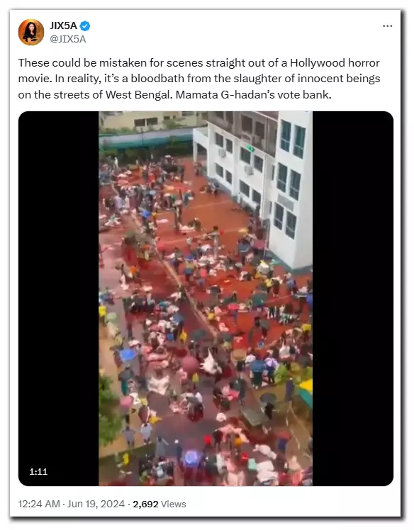 The video was posted by a verified X handle with a caption, "These could be mistaken for scenes straight out of a Hollywood horror movie. In reality, it’s a bloodbath from the slaughter of innocent beings on the streets of West Bengal. Mamata G-hadan’s vote bank." (sic)