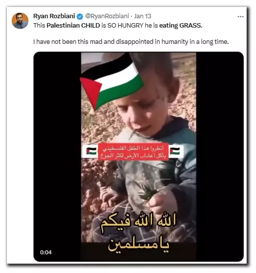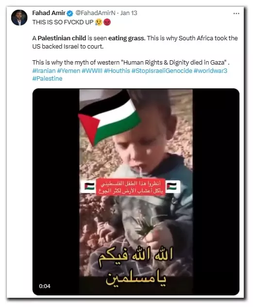 The video is being shared with a caption saying, "THIS IS SO FVCKD UP A Palestinian child is seen eating grass. This is why South Africa took the US backed Israel to court. This is why the myth of western "Human Rights & Dignity died in Gaza".