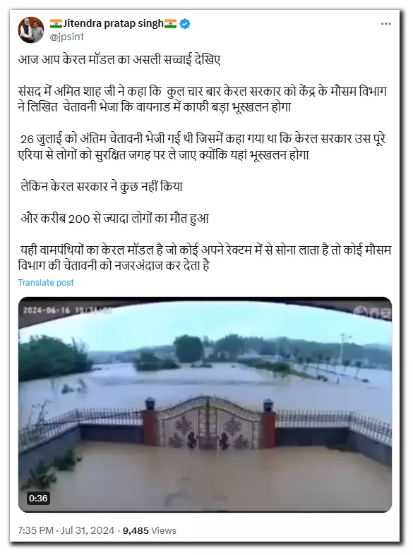 Several right-wing social media users shared the video with a Hindi caption that translates to, "Today you can see the real truth of Kerala model. Amit Shah ji said in the Parliament that the Central Meteorological Department sent a written warning to the Kerala government four times that a huge landslide would occur in Wayanad. The last warning was sent on 26 July in which it was said that the Kerala government should move people from that entire area to a safe place because there would be a landslide there. But the Kerala government did nothing. And more than 200 people died. This is the Kerala model of the leftists, where someone brings gold from his rectum and someone ignores the weather department's warning".