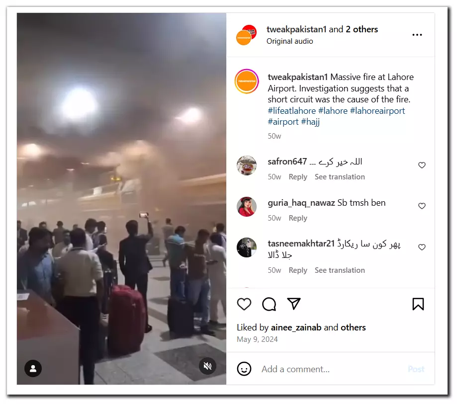 Taking a cue, we ran a related keyword search and came across a news report by Pakistan-based The Express Tribune. The report stated that a fire broke out at Lahore’s Allama Iqbal International Airport on May 9, 2024, with preliminary findings suggesting it started from a conveyor belt in the international departure lounge and quickly spread to nearby counters.