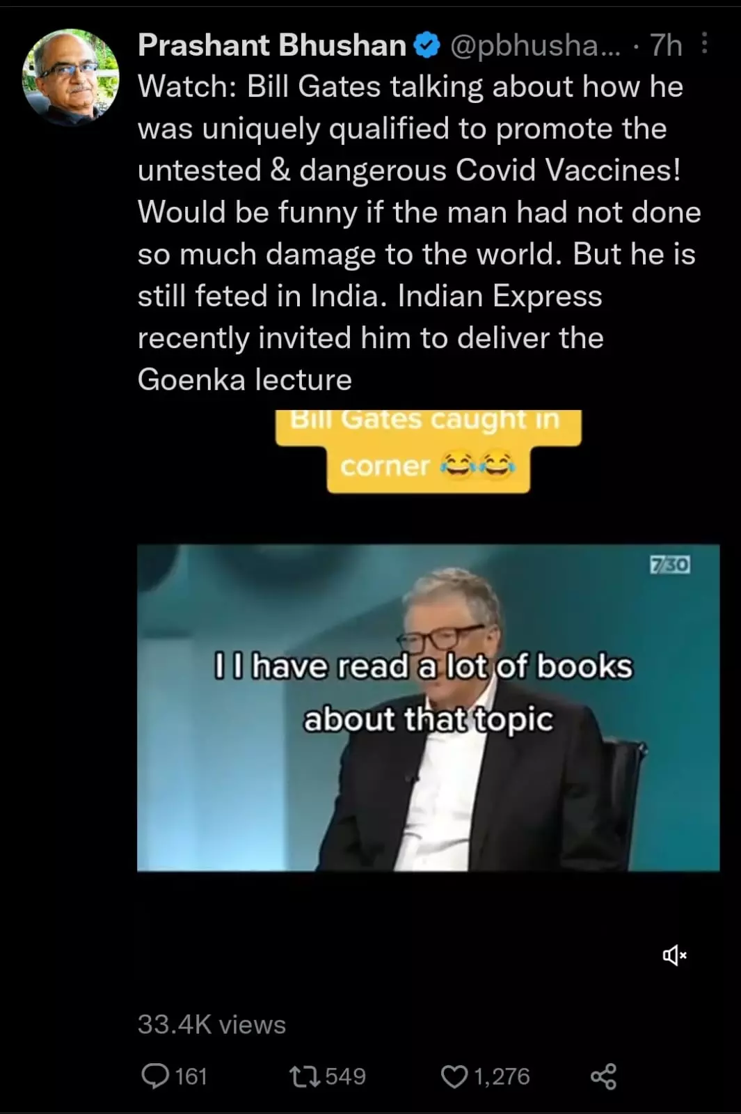 The video was tweeted by several social media users including lawyer Prashant Bhushan, who shared it with the caption, "Watch: Bill Gates talking about how he was uniquely qualified to promote the untested & dangerous Covid Vaccines! Would be funny if the man had not done so much damage to the world. But he is still feted in India. Indian Express recently invited him to deliver the Goenka lecture." The tweet was later deleted by him.