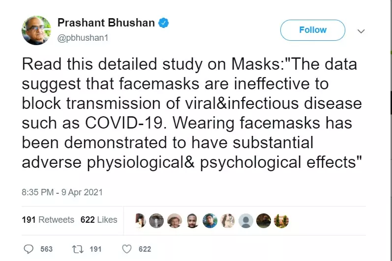 Twitter on April 10 removed a tweet by lawyer Prashant Bhushan that stated that face masks are ineffective against COVID-19 based on a study by a US-based cardiologist. The platform removed the tweet as it did not meet its community standards and COVID-19 guidelines.