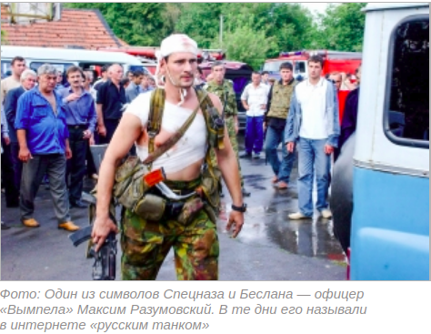 BOOM translated the caption from Russian to English and it reads, 'One of the symbols of Special Forces and Beslan is Vympel officer Maxim Razumovsky. In those days they called him on the Internet 'Russian tank''