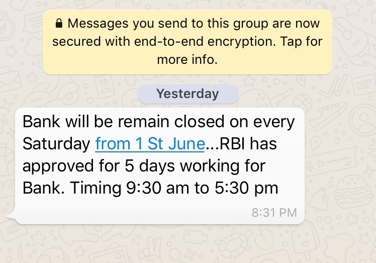 Speaking to BOOM, Vishwas Uttagi representing United Forum Of Bank Unions, an umbrella body of 9 PSU banks unions, confirmed that the message is a hoax. "This is our long pending demand and the last wage settlement approved alternate weekends off for bank employees. We will be meeting with the IBA on May 2 at 4 pm to initiate discussions on our many pending demands. But as of date, there is no such notification from the RBI and we are yet to begin any fresh talks on the matter of 5-day week," said Uttagi.