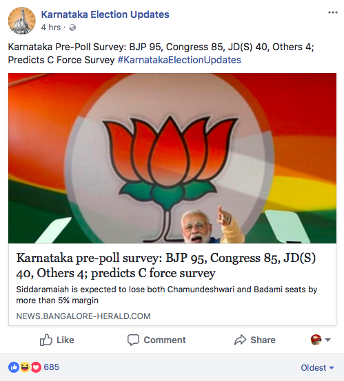 The article has been shared on a Facebook page Karnataka Election Updates and has 685 likes and 59 shares.