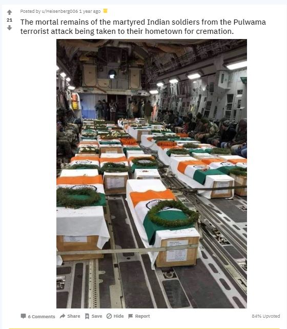 This image has existed online since February 2019, when the incidents of Pulwama took place. The Pulwama terrorist attack on February 14, 2019, killed 40 personnel belonging to the Central Reserve Police Force in a suicide attack.