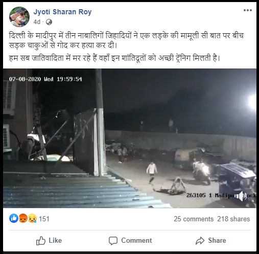 (Original text in Hindi : दिल्ली के मादीपुर में तीन नाबालिगों जिहादियों ने एक लड़के की मामूली सी बात पर बीच सड़क चाकुओं से गोद कर हत्या कर दी। हम सब जातिवादिता में मर रहे हैं वहाँ इन शांतिदूतों को अच्छी ट्रेंनिग मिलती है)
