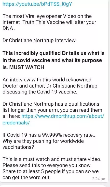 The caption with the video reads, The most viral eye opener video on the internet. Truth This Vaccine will alter your DNA. ๐ง๐ต๐ถ๐ ๐ถ๐ป๐ฐ๐ฟ๐ฒ๐ฑ๐ถ๐ฏ๐น๐ ๐พ๐๐ฎ๐น๐ถ๐ณ๐ถ๐ฒ๐ฑ ๐๐ฟ ๐๐ฒ๐น๐น๐ ๐๐ ๐๐ต๐ฎ๐ ๐ถ๐ ๐ถ๐ป ๐๐ต๐ฒ ๐ฐ๐ผ๐๐ถ๐ฑ ๐๐ฎ๐ฐ๐ฐ๐ถ๐ป๐ฒ ๐ฎ๐ป๐ฑ ๐๐ต๐ฎ๐ ๐ถ๐๐ ๐ฝ๐๐ฟ๐ฝ๐ผ๐๐ฒ ๐ถ๐. ๐ ๐จ๐ฆ๐ง ๐ช๐๐ง๐๐! An interview with this world reknowned Doctor and author; Dr Christiane Northrup discussing the Covid-19 vaccine. If Covid-19 has a 99.999% recovery rate... Why are they pushing for worldwide vaccinations?"