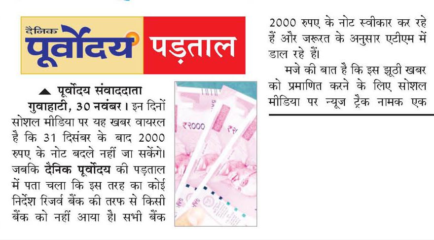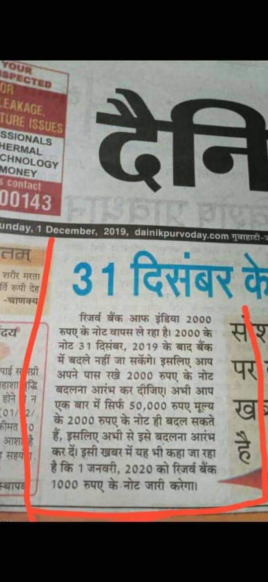 After explaining the claim the article states: "Nowadays, a piece of news has been viral on social media that post-December 31, 2019 ₹2000 notes cannot be exchanged. Whereas, an investigation by Dainik Purvoday has revealed that 'no such instructions' were issued by Reserve Bank of India..."