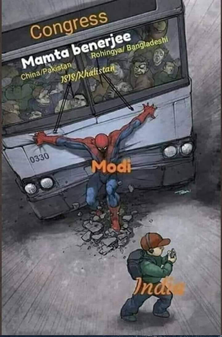 The cartoon can be seen below. It shows Spiderman (with the words 'Modi') singularly stopping a train (depicted to be terrorists such as ISIS and Khalistanis; Pakistan and China and Rohingyas and Bangladesh, and the opposition) from hitting a child (here, India).