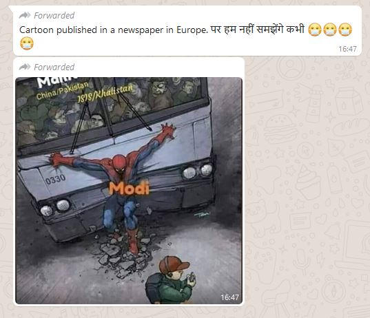 The claim surrounding a viral cartoon being circulated on Twitter and WhatsApp, which claims to be from a European newspaper, is false, as BOOM found no evidence of such a newspaper or publication carrying the cartoon. The cartoon is an iteration of a popular Spiderman-centric meme, which implicitly projects Prime Minister Narendra Modi single-handedly saving India from the opposition and from foreign forces. Rather than a European newspaper, the meme was shared by David Vance, associated with AltNewsMedia, a British right-wing website.