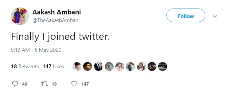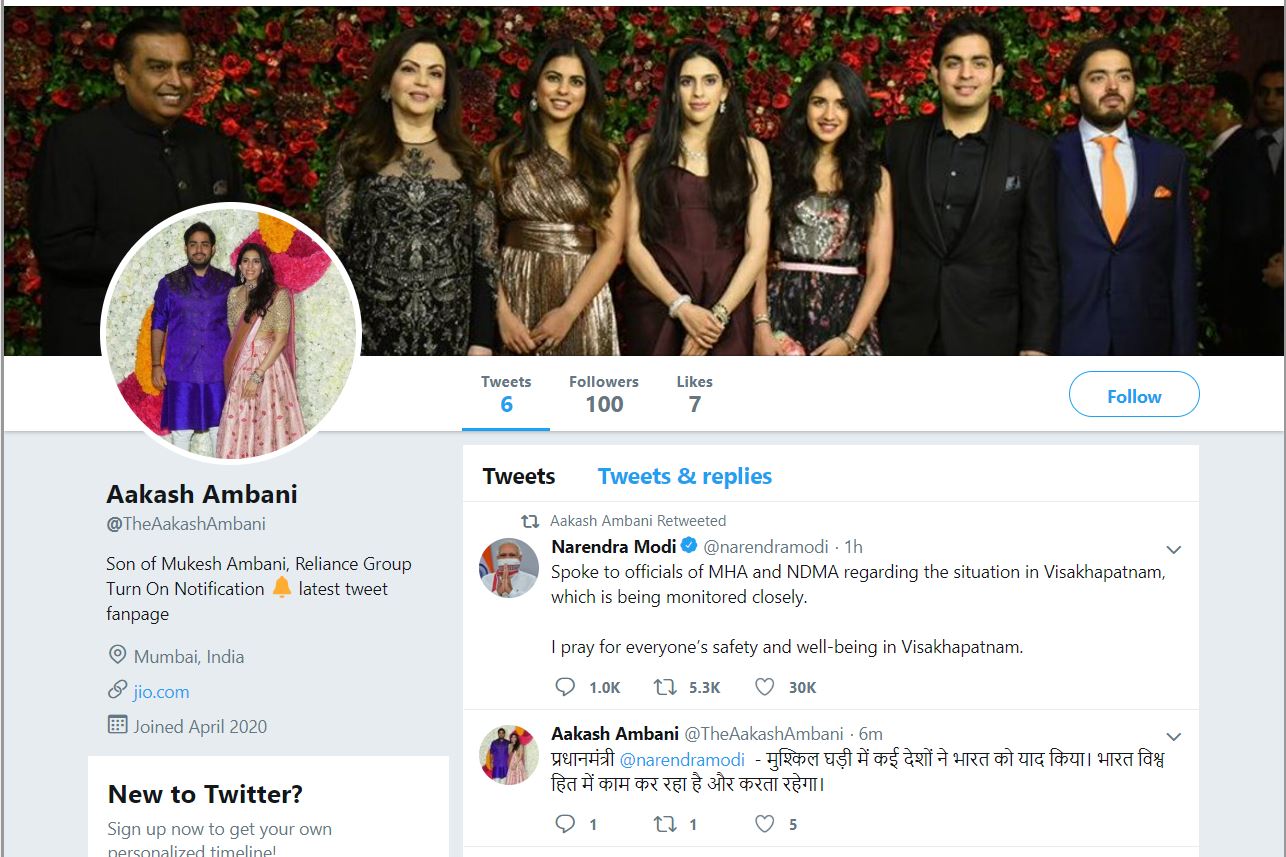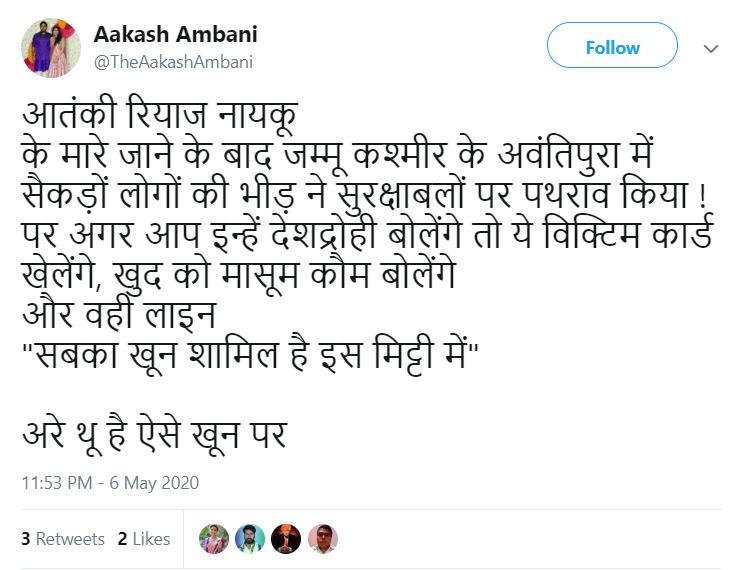 The fake Twitter account going by the handle @TheAakashAmbani tweeted on various news topics from the encounter of top Hizbul Mujahideen commander Riyaz Naikoo in Kashmir, to tweeting asking if Congress leader Rahul Gandhi had one ability to become the prime minister, and tweeting against those opposing Hindutva.