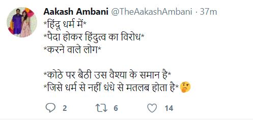 (Translation from Hindi: People who oppose Hindutva after being born in Hinduism are like a prostitute sitting on the brothel, which means they have no relation to the religion, but business)
