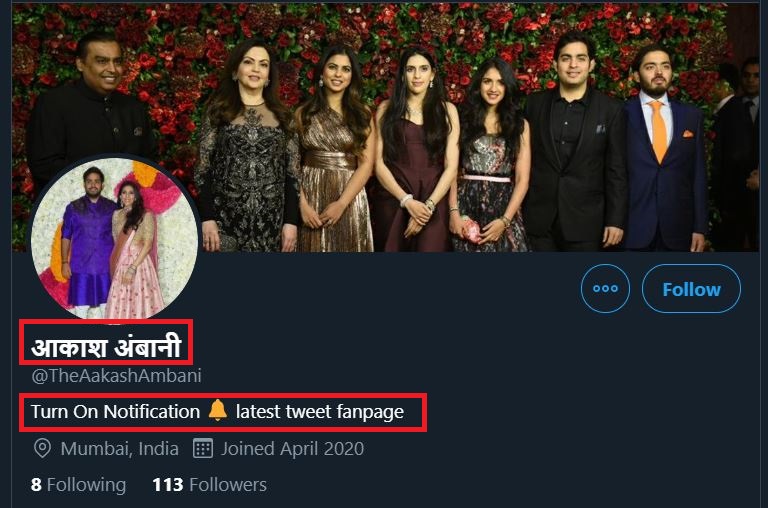 At the time of writing this article, the fake account changed it's Twitter bio removing 'Son of Mukesh Ambani, Reliance Group' and changing its name from English to Hindi script.