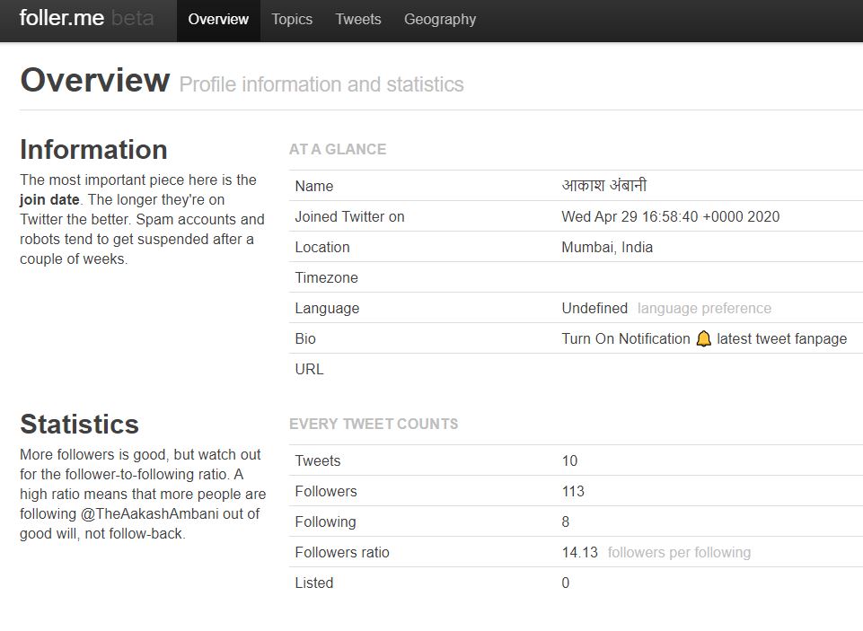 We ran the account threw the Twitter analytics tool Foller.me and found that the account had joined Twitter on April 29, 2020, gaining 113 followers to date.