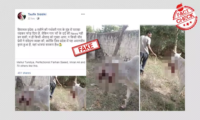(Original Text in Hindi: हिमाचल प्रदेश: 8 महीने की गर्भवती गाय के मुंह में पटाखा रखकर फोड़ दिया है, लेकिन गाय 'माँ' के दर्द की News नही बन सकी, न ही किसी औलाद को गुस्सा आया, न किसी जीव प्रेमी ने संवेदना व्यक्त की, क्योंकि जिस प्रदेश में यह अमानवीय कृत्य हुआ है, वहां भाजपा सरकार है!!!)