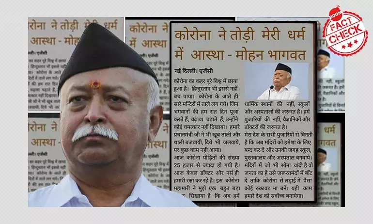A screenshot purporting to be a newspaper clipping claiming Rashtriya Swayamsevak Sangh chief Mohan Bhagwat said the COVID-19 pandemic has shaken his faith in religion, is fake.