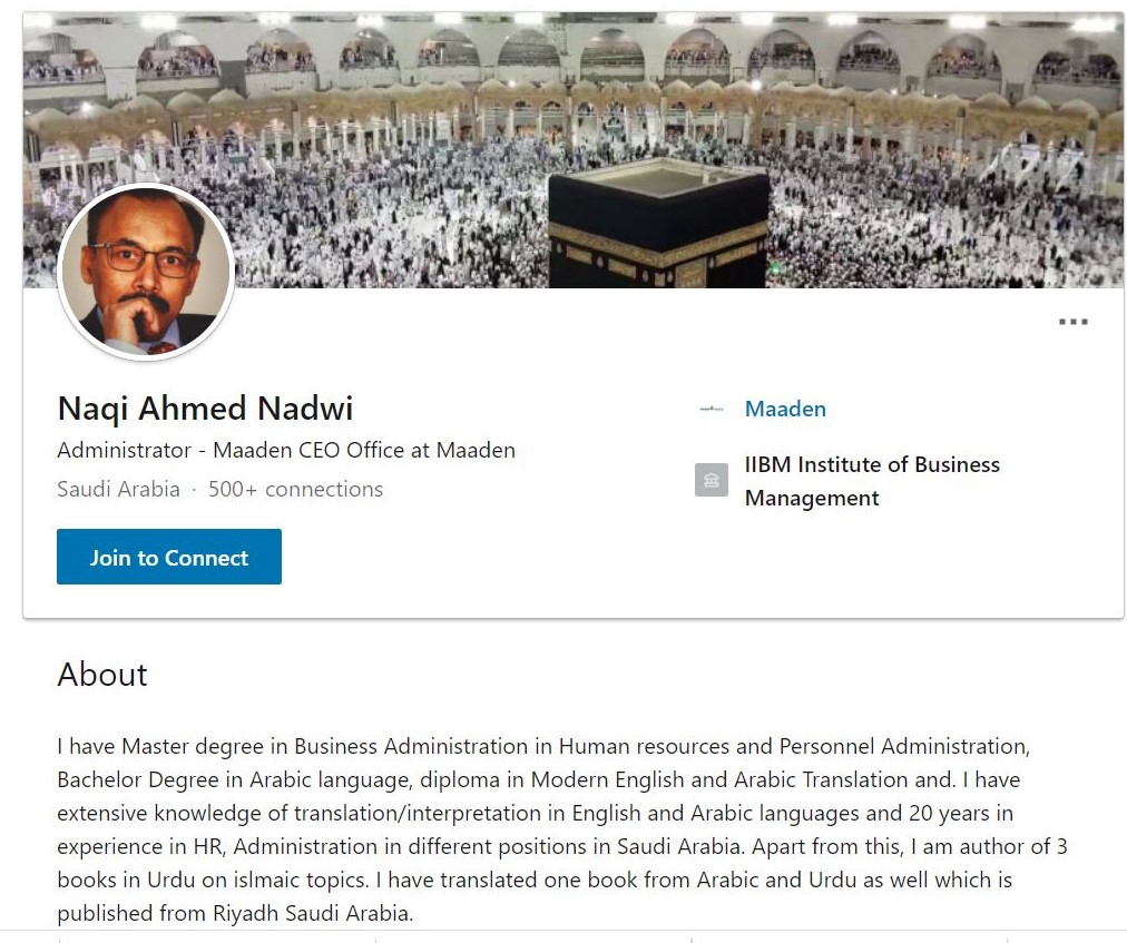 A LinkedIn profile in the same name uses the photo of the man seen in the viral video as a display picture. The profile mentions that Naqi Ahmed Nadvi currently works as an administrator at a Saudi Arabia based firm Maaden.