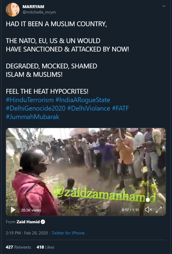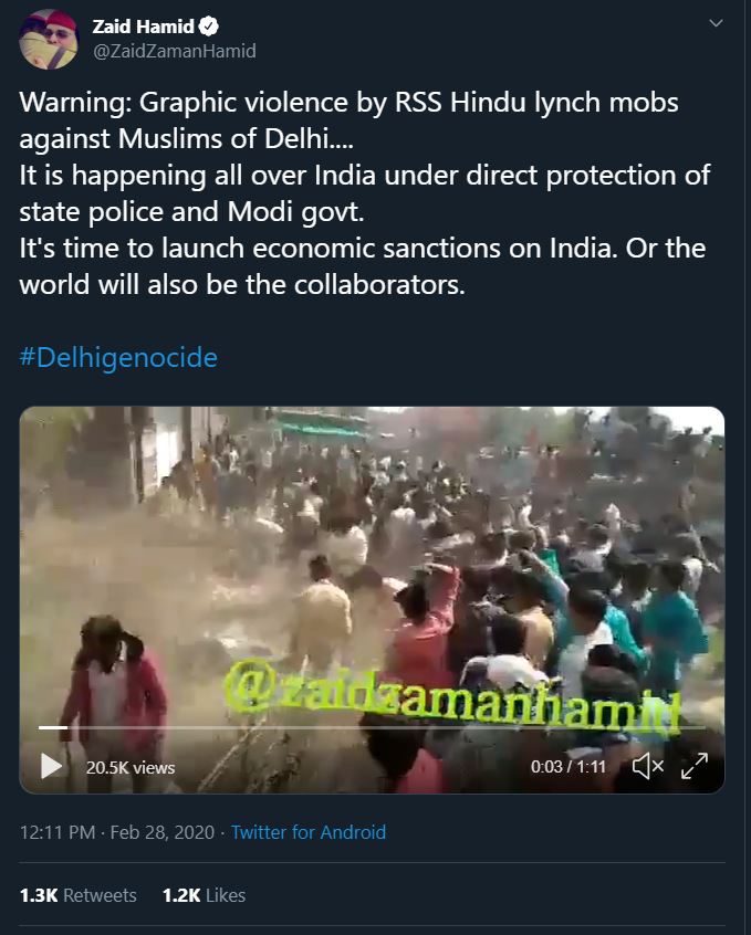 The 1.11 minutes clip was also shared by Zaid Hamid, with the caption: "Graphic violence by RSS Hindu lynch mobs against Muslims of Delhi.."