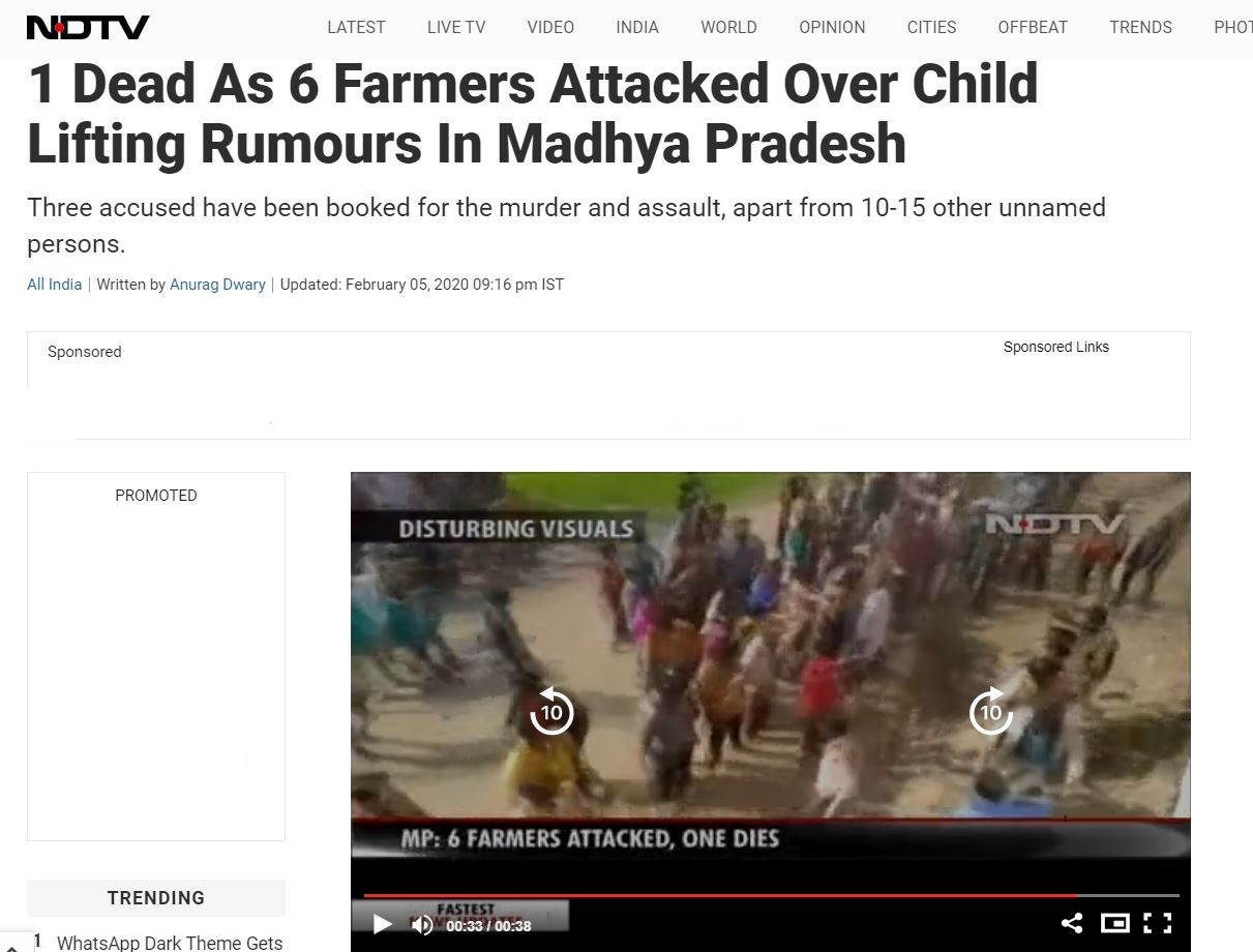 The incident is from February 5, 2020, when one farmer was beaten to death and five others were injured by a mob after rumours of a gang of child lifters being active in the area were spread by people who owed money to the victims.