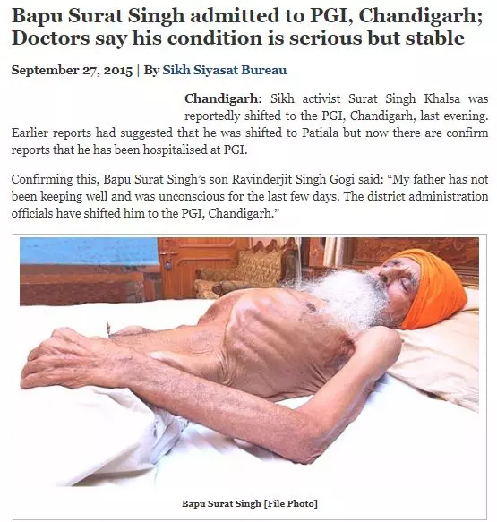 The report states that Sikh activist Surat Singh Khalsa was shifted to PGI, Chandigarh on September 26. BOOM also came across other news reports from 2015 carrying the same image. The photo according to reports is from January 2015 when Khalsa began his fast.