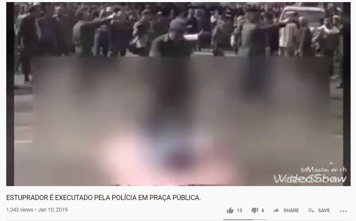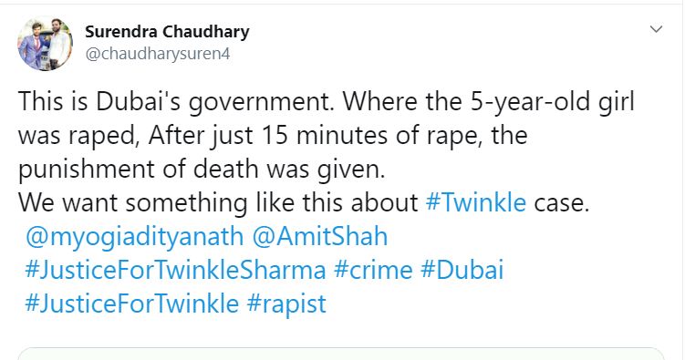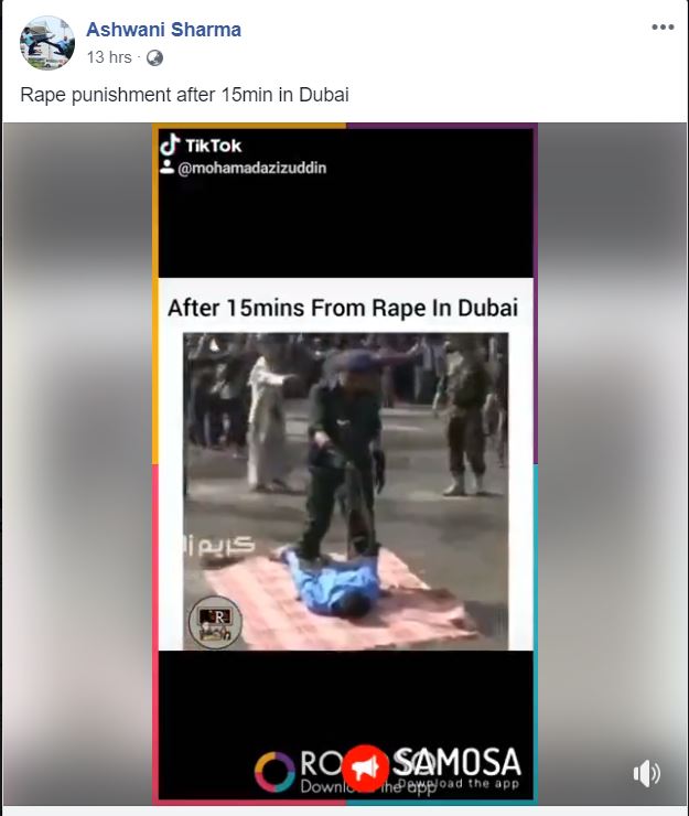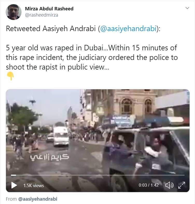 The 1 minute 42 second video shows the accused being shot at from a point blank range by policemen. Amidst protests, his corpse is tied and hung from atop a crane. The video has been captioned as, "5 year old was raped in Dubai...Within 15 minutes of this rape incident, the judiciary ordered the police to shoot the rapist in public view..."