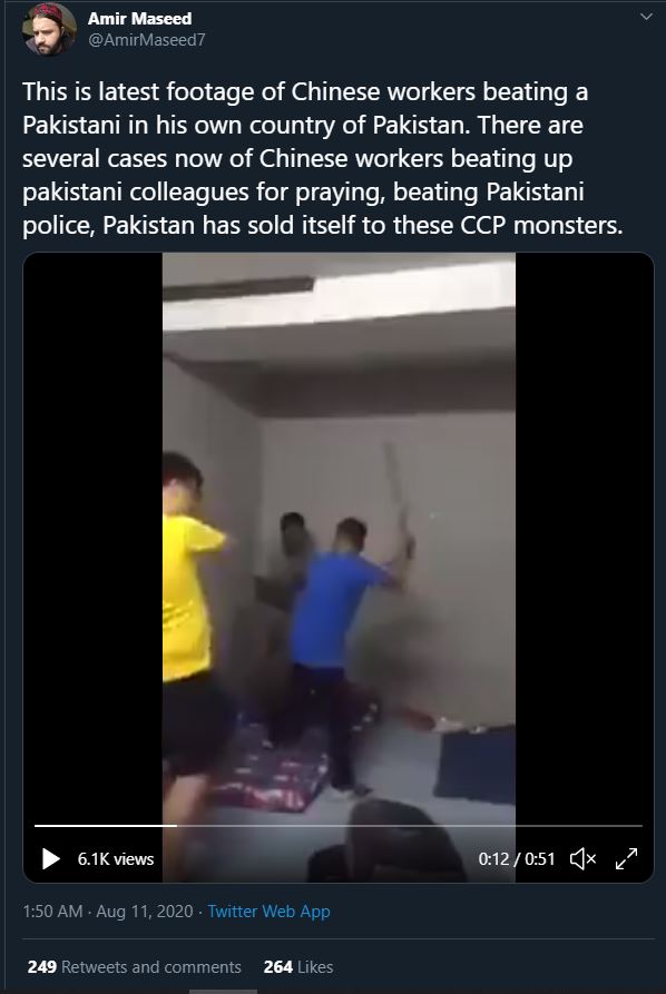 A video showing a man wearing a blue T-shirt flogging a man with a stick, while the third man in a yellow t-shirt stands by and watches on is being shared claiming that it is from Pakistan showing Chinese workers beating a Pakistani man. The video is being shared among Pakistani netizens on Facebook and Twitter.