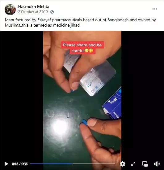 The video clip is being shared on facebook with a caption, “Manufactured by Eskayef pharmaceuticals based out of Bangladesh and owned by Muslims. This is termed as medicine jihad.” BOOM also received the video via its WhatsApp tipline for verification.